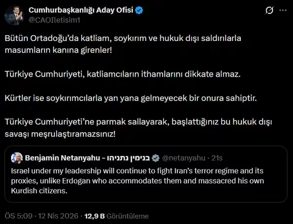İsrail Başbakanı Binyamin Netenyahu dün yaptığı sosyal medya paylaşımında "Benim liderliğim altındaki İsrail, İran'ın terör rejimi ve onun vekilleriyle mücadeleye devam edecek; oysa Erdoğan, bu güçlere taviz veriyor ve kendi Kürt vatandaşlarını katlediyor" ifadelerine yer vermiş, bu açıklamalar birçok siyasi tarafından tepkiyle karşılanmıştı.