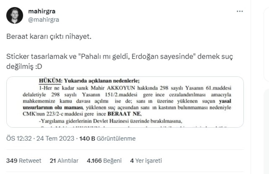 Sosyal medya hesabından kararı paylaşan Akkoyun, "Beraat kararı çıktı nihayet. Sticker tasarlamak ve 'Pahalı mı geldi, Erdoğan sayesinde' demek suç değilmiş :D" ifadelerine yer verdi.