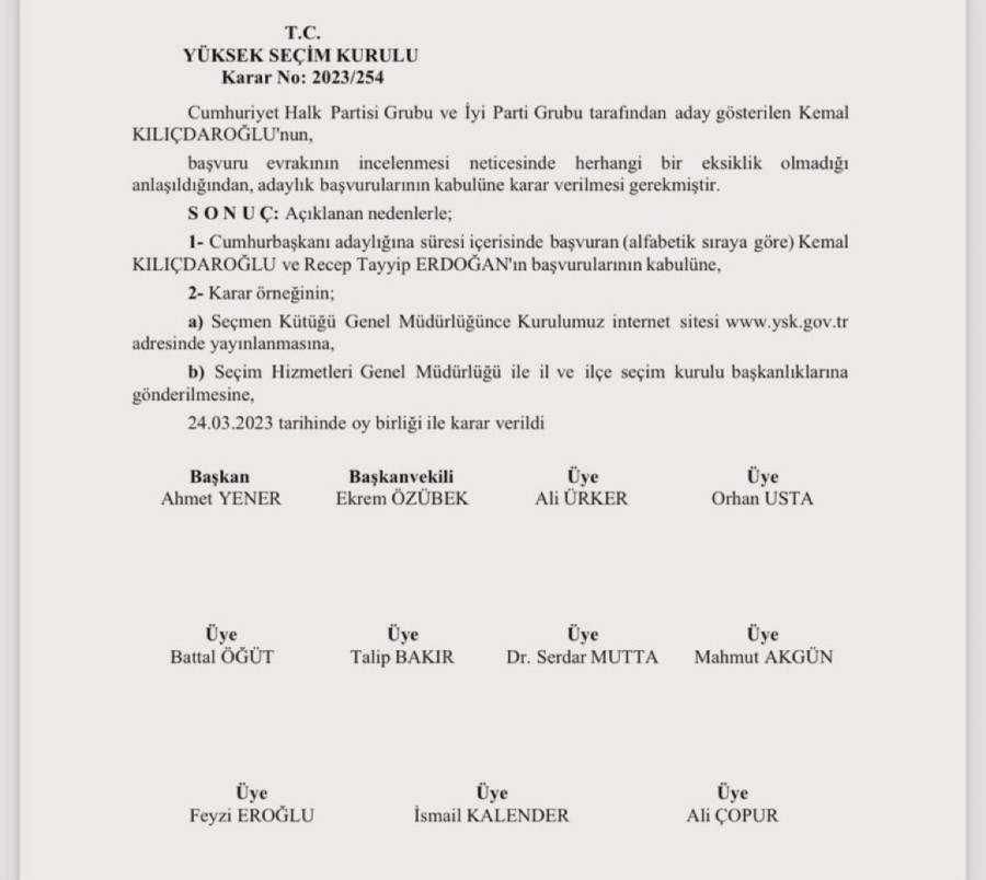Yüksek Seçim Kurulu (YSK), Cumhur İttifakı'nın cumhurbaşkanı adayı Recep Tayyip Erdoğan ile Millet İttifakı'nın cumhurbaşkanı adayı Kemal Kılıçdaroğlu'nun adaylık başvurularının kabul edildiğini duyurdu.