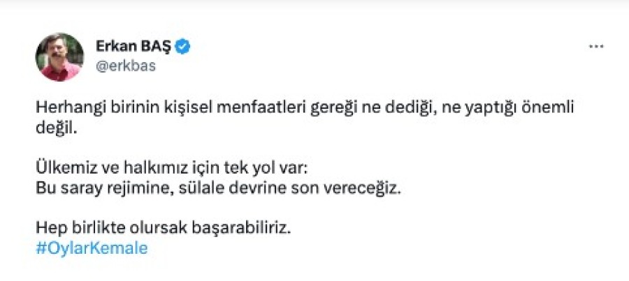 "Herhangi birinin kişisel menfaatleri gereği ne dediği ne yaptığı önemli değil. Ülkemiz ve halkımız için tek yol var: Bu saray rejimine, sülale devrine son vereceğiz. Hep birlikte olursak başarabiliriz. Oylar Kemal'e."