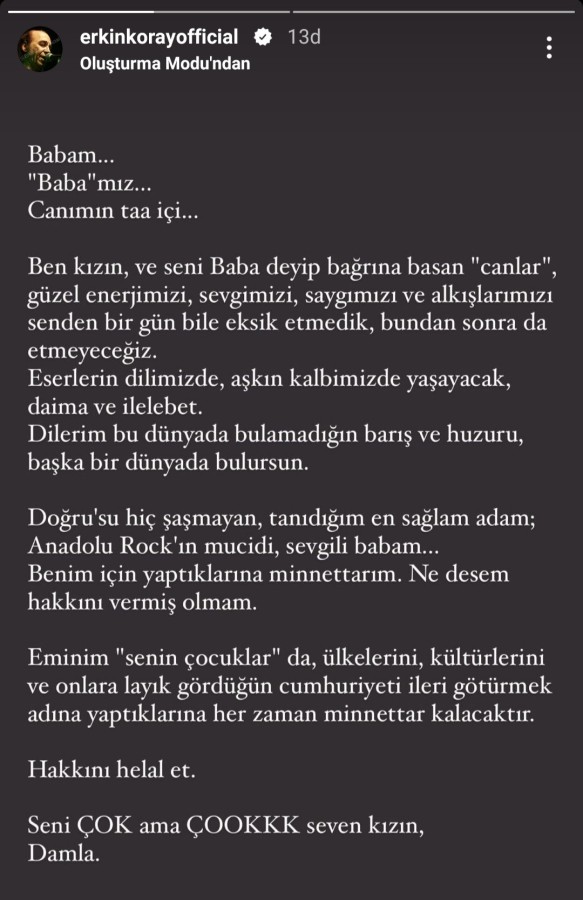 "Babam... 'Baba'mız... Canımın taa içi... Ben kızın, ve seni 'baba' deyip bağrına basan 'canlar', güzel enerjimizi, sevgimizi, saygımızı ve alkışlarımızı senden bir gün bile eksik etmedik, bundan sonra da etmeyeceğiz. Eserlerin dilimizde, aşkın kalbimizde yaşayacak, daima ve ilelebet. Dilerim bu dünyada bulamadığın barış ve huzuru, başka bir dünyada bulursun. Doğrusu hiç şaşmayan, tanıdığım en sağlam adam; Anadolu Rock'ın mucidi, sevgili babam... Benim için yaptıklarına minnettarım. Ne desem hakkını vermiş olmam. Eminim senin çocuklar' da, ülkelerini, kültürlerini ve onlara layık gördüğün cumhuriyeti ileri götürmek adına yaptıklarına her zaman minnettar kalacaktır. Hakkını helal et. Seni çok ama çoook seven kızın, Damla."