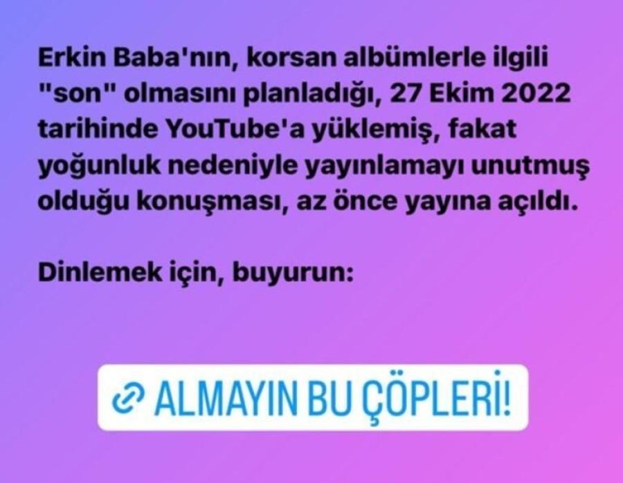 "Merhaba bizim çocuklar... Büyük de olsalar bizim çocuklar... Bunun adı böyle. Bin yaşına da gelsek, beraber olacağımız bizim çocuklar. Size önemli bir mesajım var. Bu konu çok oldu artık, biliyorum. Biz bıktık ama onlar bıkmadılar. Sülük gibi mübarekler. Neyse ben son olarak size şunları söyleyeyim, konuyu kapatayım. Çoktandır 'artık bu sondur' diye bekliyorum ama bu çapulculuğun ardı arkası kesilmedi. Aşağı yukarı son 10 yıldır bir takım firmalar plaklarımı basıp duruyorlar. Benim iznim yok, ruhsatsız. Ne şekilde alındığı belli olmayan bandrollerle plak kapağını bile kendi suratlarına benzetmişler. İşe bak. Yapmışsınız saçma sapan bir şey, bırakın hiç olmazsa plak kapağını ben seçeyim. Hadi diyelim ki piyasaya böyle çıkardılar, bari bir şeye benzeseler. İçeriği saçma sapan değiştirilmiş, ucuza mal etmek için de kalitesiz basılmış plaklar... Bu yetkisiz adamlar şarkıların üzerinde oynaya oynaya ellerinde kaliteli kayıt da kalmadı zaten. İşe bak, memleketin haline bak. Üzülmemek elde değil maalesef. İçine ettiniz ulan güzelim memleketin.Allahsızlar! Ama kazandığım davalar, bir takım kişilerin hiçe saydığı davalar bunların dosyaları kasamda duruyor. Kaybolmadılar yani... Eserlerin ise orijinalleri ve daha piyasaya çıkmamış nice tertemiz stüdyo kayıtları bende mevcut. Bu güzel ülkeye hukuk ve adalet geldiği gün; hepsini size vereceğim. Size sözümdür. Önlemimi de aldım merak etmeyin. Ben olmasam da kızım bunların hepsini size verecek. Dava dosyalarım da onda tabii. Onlar bir köşede dursun. 'Gün ola, harman ola' demiş erenler... Boşuna söylememişlerdir. Hepinizin gözlerinden öperim. Bir gün bu parazitlerden mutlaka kurtulacağız. O güne kadar sağlıcakla kalın. Selam ve sevgilerimle... Almayın bu 'Erkin Koray plakları' adı altında çıkardıkları çöpleri..."