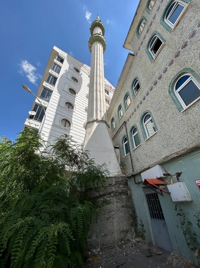 Yaklaşık 8 katlı bir apartmanla aynı yükseklikte olan Muhyiddin-i Arabi Camii'nin minaresi, binalarla neredeyse bitişik halde inşa edilmiş durumda.