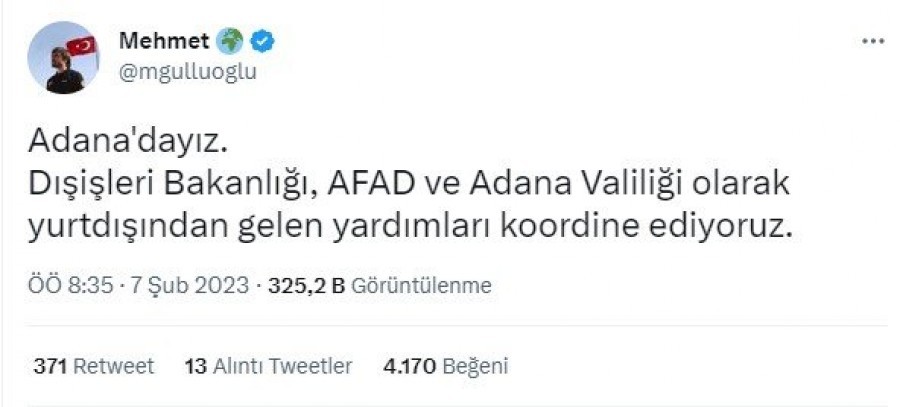 "Adana'dayız. Dışişleri Bakanlığı, AFAD ve Adana Valiliği olarak yurtdışından gelen yardımları koordine ediyoruz."