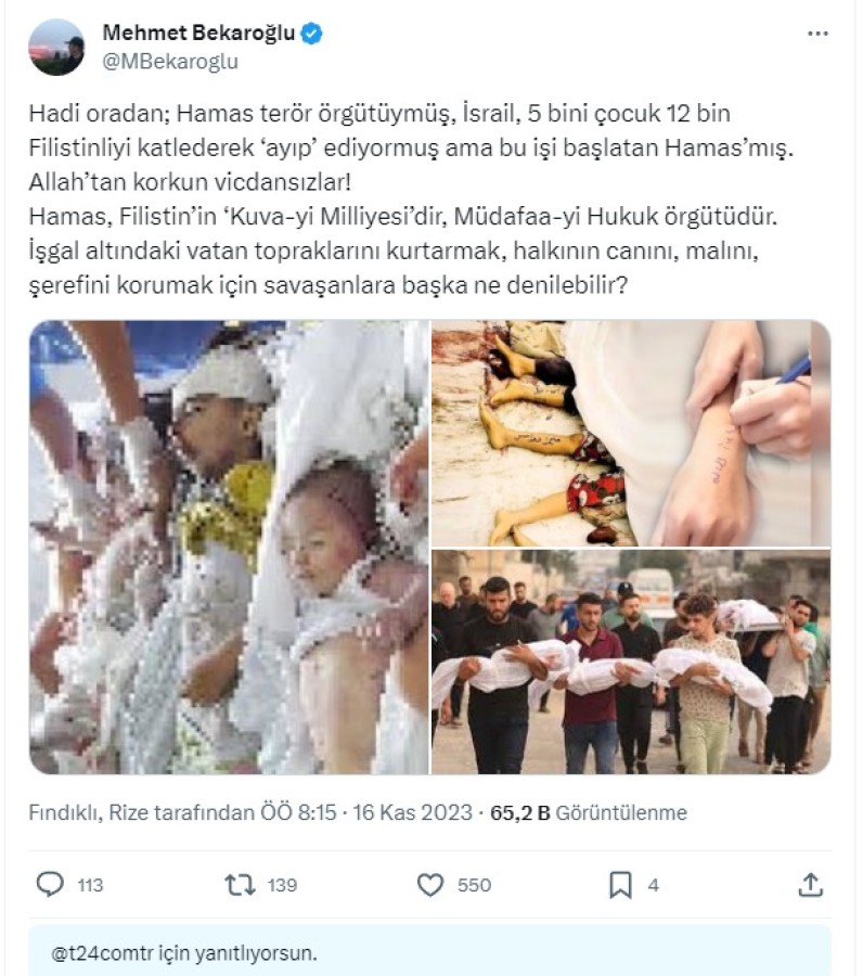 Sosyal medya hesabından paylaşım yapan Bekaroğlu, Hamas'a "terör örgütü" denilmesini eleştirerek, "Hadi oradan; Hamas terör örgütüymüş, İsrail, 5 bini çocuk 12 bin Filistinliyi katlederek 'ayıp' ediyormuş ama bu işi başlatan Hamas'mış. Allah'tan korkun vicdansızlar Hamas, Filistin'in 'Kuva-yi Milliyesi'dir, Müdafaa-yi Hukuk örgütüdür. İşgal altındaki vatan topraklarını kurtarmak, halkının canını, malını, şerefini korumak için savaşanlara başka ne denilebilir?" ifadelerine yer verdi.