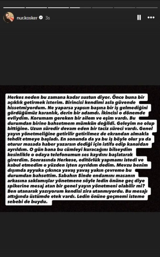 "Benim evli olduğum dönemden başlayan ve çok uzun süreli bir taciz süreci var. İşte asansör kapısını tutup bilmem neler falan. Sonra attığı saçma sapan mesajlar var. İşte 'Sabah bülteninde LED'in önüne geç. Bacaklarını göreyim. Masanın arkasına saklamışlar' bilmem neler. Böyle bir genel yayın yönetmeni olabilir mi ya? En son işte o asıl bomba kısmı. Beni 'Oturur masada haber yazarsın' diyerek ekrandan almakla tehdit etmişti. Burayla ilgili bir delilim yok. Bunu söyleyeceğini bilsem kesinlikle o odaya ses kaydı alarak girerdim. Sonrasında ben de 'Anladım ben seni. Şöyle çözelim. Ben istifa edeyim gideyim' dedim ve çıktım öyle.