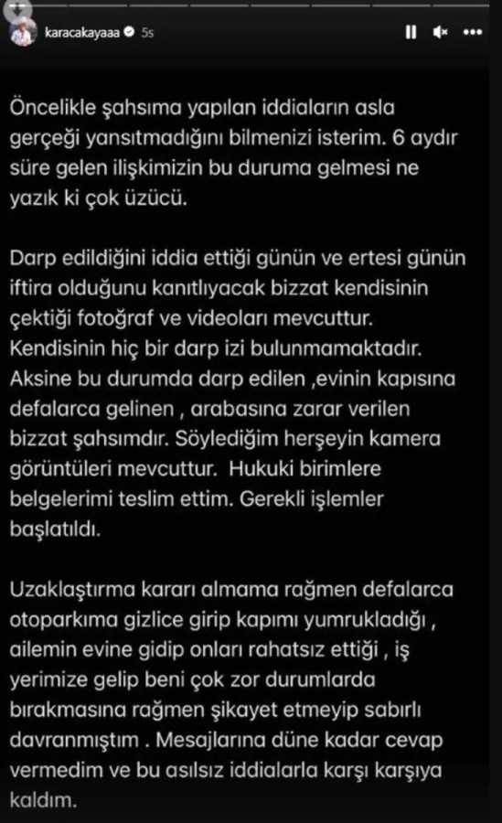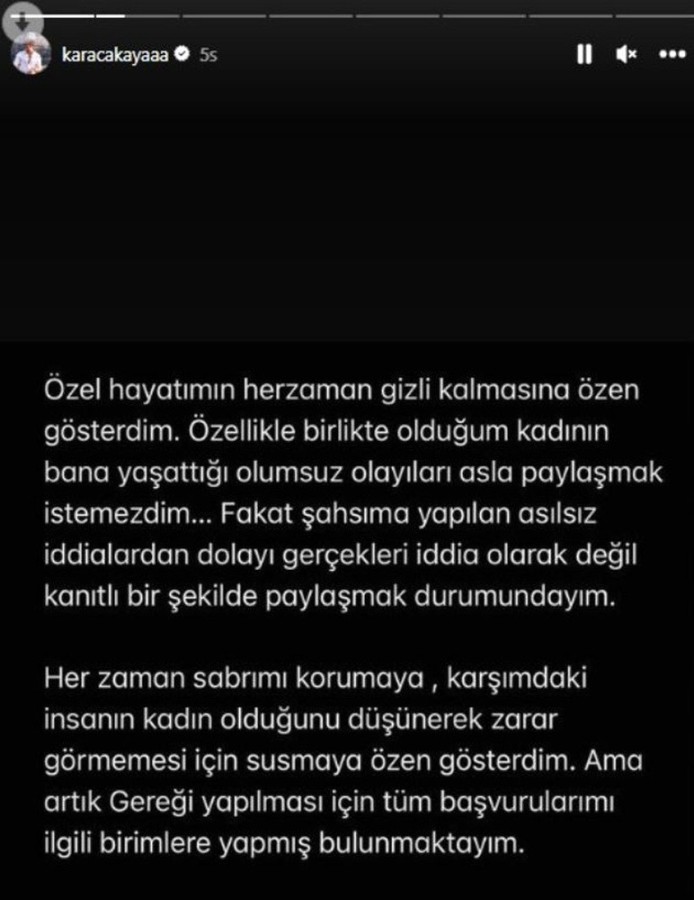 Uzaklaştırma kararı almama rağmen defalarca otoparkıma gizlice girip kapımı yumrukladığı ailemin evine gidip onları rahatsız ettiği, iş yerimize gelip beni çok zor durumlarda bırakmasına rağmen şikayet etmeyip sabırlı davranmıştım. Mesajlarına düne kadar cevap vermedim ve bu asılsız iddialarla karşı karşıya kaldım. Özel hayatımın her zaman gizli kalmasına özen gösterdim. Özellikle birlikte olduğum kadının bana yaşattığı olumsuz olayları asla paylaşmak istemezdim... Fakat şahsıma yapılan asılsız iddialardan dolayı gerçekleri iddia olarak değil kanıtlı bir şekilde paylaşmak durumundayım. Her zaman sabrımı korumaya, karşımdaki insanın kadın olduğunu düşünerek zarar görmemesi için susmaya özen gösterdim. Ama artık gereği yapılması için tüm başvurularımı ilgili birimlere yapmış bulunmaktayım."