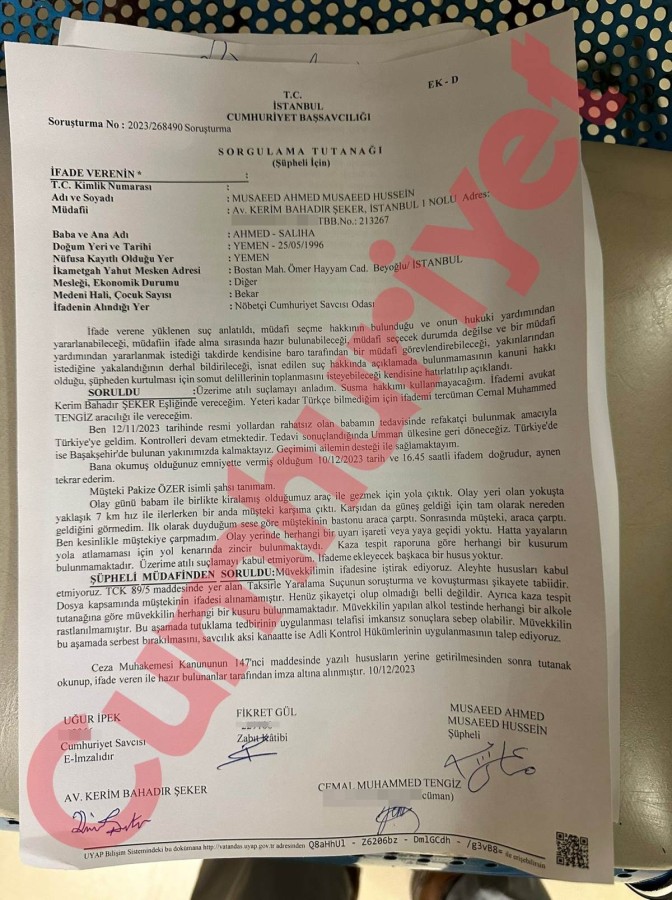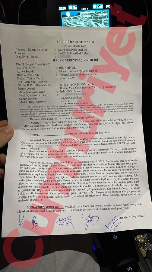 Hussein ifadesinde, "Ben aslen yemen vatandaşıyım. Türkiye'ye gelme amacım babamı tedavi ettirmek içindir. Bugün babamla gezmeye çıkmıştık. Kullanmış olduğum araca bir kadın yanda çarptı. Bakmaya gittiğimde kadın şahsın baş kısmında kanama vardı. Bende kanamayı durdurmak için başörtüsüyle bağlayarak kanamayı durdurdum ve çevredeki vatandaşlar bize yardımcı oldu. Böyle bir kaza yaşanmasından kaynaklı çok pişmanım. Kendimde herhangi bir kusur olduğunu düşünmüyorum. Kadın şahıs yaya olmayan yerden karşıdan karşıya geçmeye çalıştığı sırada aracıma yandan vurmak marifetiyle kazaya sebebiyet verdi" dedi.