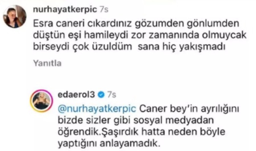 "Esra, Caner'i çıkardınız gözümden gönlümden düştün. Eşi hamileydi zor zamanında olmayacak bir şeydi. Çok üzüldüm sana hiç yakışmadı"