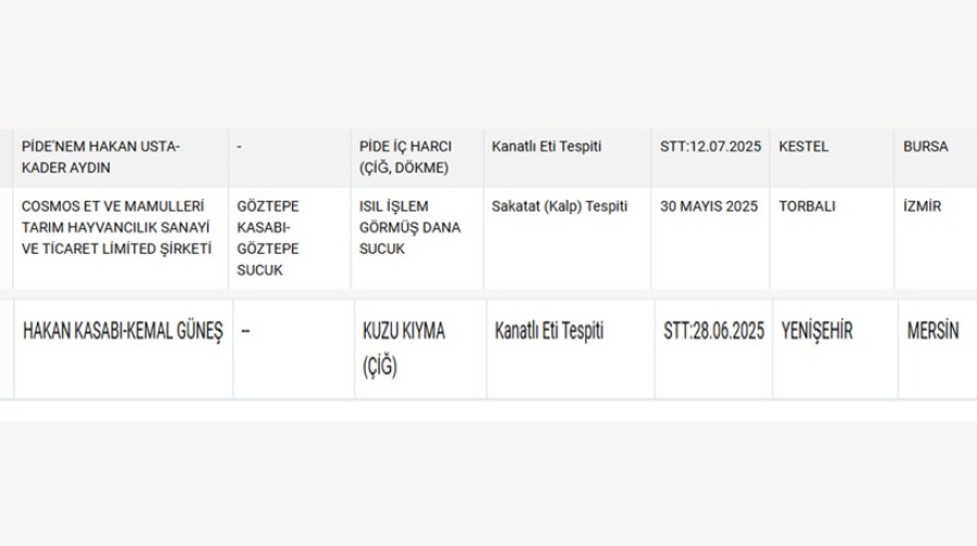 Listede yer alan bilgiye göre, Mersin'de faaliyet gösteren Hakan Kasabı-Kemal Güneş isimli firmanın kuzu kıymasında kanatlı eti tespit edildi.