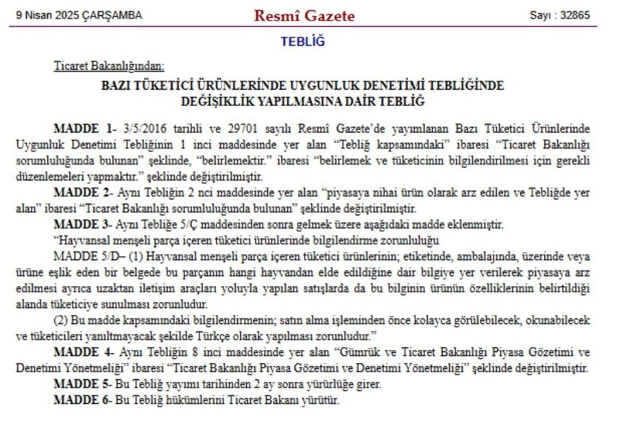Tekstil ve ayakkabı başta olmak üzere, Ticaret Bakanlığının sorumluluğunda bulunan tüketici ürünlerinde hayvansal menşeli parça yer alması durumunda, bu parçaların hangi hayvandan elde edildiğine dair bilginin tüketicilere belirtilmesi zorunlu hale getirildi.