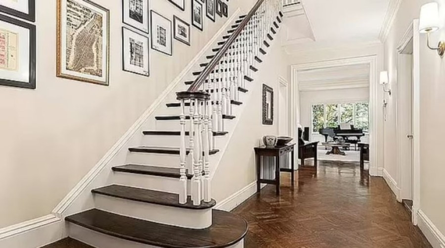 Ziyaretçiler eve girdiklerinde yüksek tavanlar ve büyük merdivenlere çıkan geniş bir fuaye ile karşılanıyor.