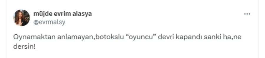Her paylaşımı olay olan ünlü isim bu defa botokslu oyuncuları hedef aldı. Evrim Alasya sosyal medya hesabından 'Oynamaktan anlamayan,botokslu "oyuncu" devri kapandı sanki ha,ne dersin!' diyerek bir paylaşım yaptı.