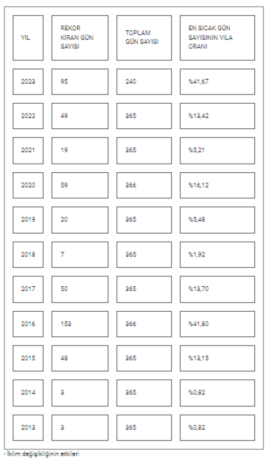 Kurnaz'ın verdiği bilgilere göre, her günün geçmiş yıllardaki aynı güne ait sıcaklık değeriyle kıyaslandığı hesaplamada, sıcaklık rekoru kırılan gün sayısı, 2013'ten bu yana aşağıdaki gibi gerçekleşti: