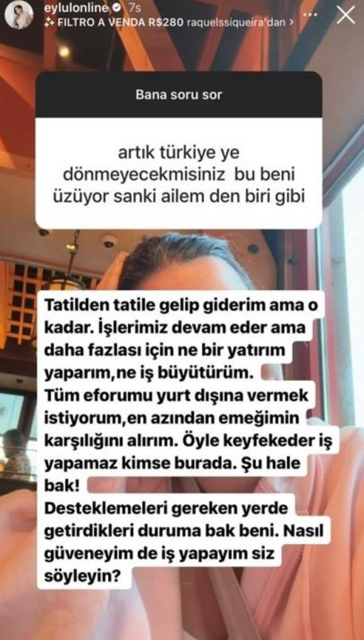 Ardından takipçileri ile soru cevap yapan Eylül Öztürk 'Artık Türkiye'ye dönmeyecek misiniz?' sorusuna yanıt verdi.