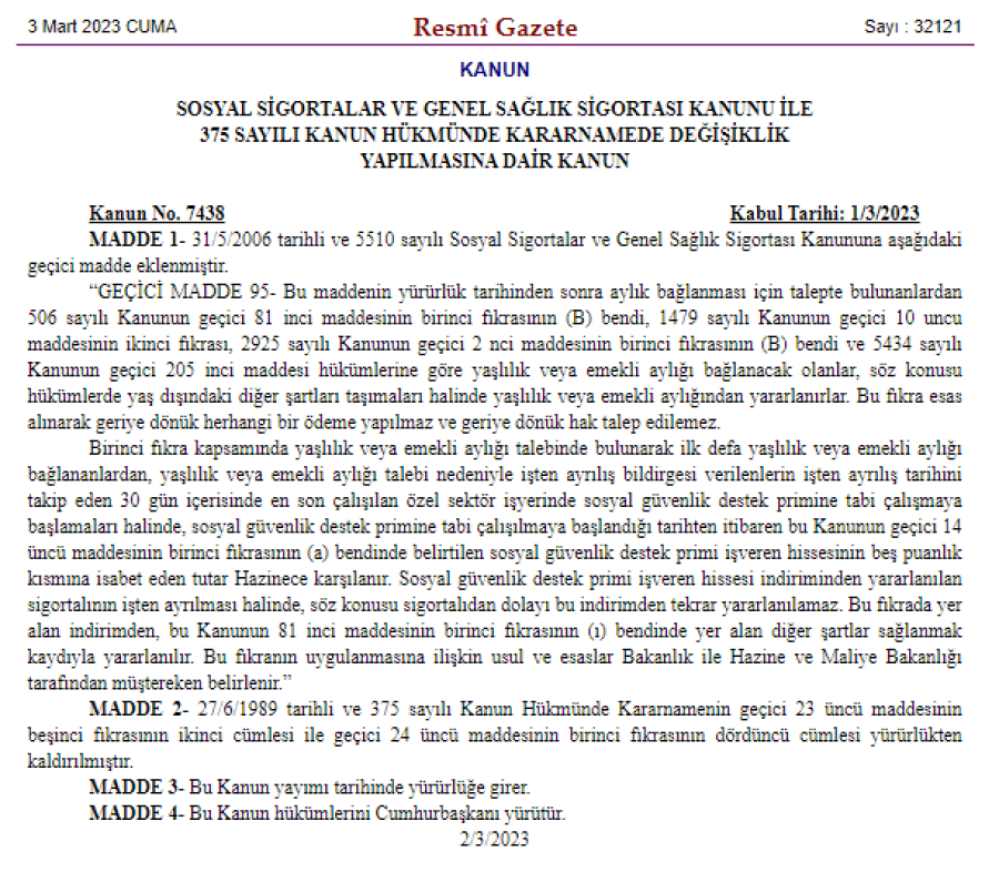 Kanundaki düzenleme ile Sosyal Sigortalar ve Genel Sağlık Sigortası Kanunu'na geçici madde eklenerek ilgili kanunlara göre kanunun yürürlük tarihinden sonra aylık bağlanması talebinde bulunanlardan yaşlılık veya emekli aylığı bağlanacak olanlar, söz konusu hükümlerde yaş dışındaki diğer şartları taşımaları halinde yaşlılık veya emekli aylığından yararlanacak.