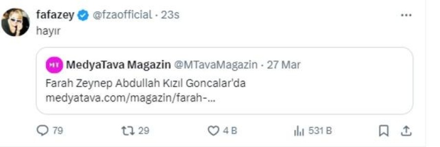 Farah Zeynep Abdullah hakkında çıkan iddialara sosyal medya hesabından cevap verdi. Ünlü oyuncu 'Farah Zeynep Abdullah Kızıl Goncalar'da' haberini alıntılayarak 'Hayır' yazdı.