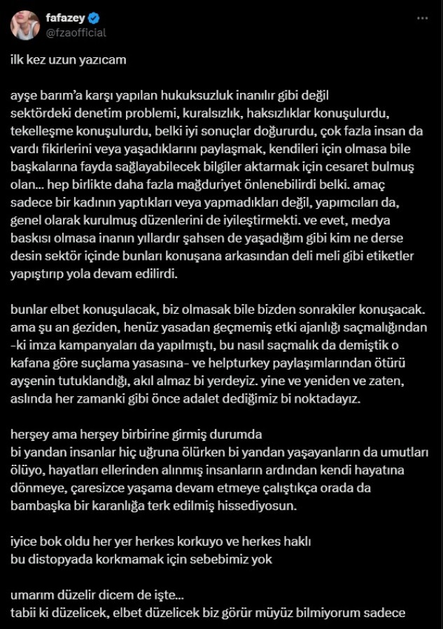 "İlk kez uzun yazıcam Ayşe barım'a karşı yapılan hukuksuzluk inanılır gibi değil,