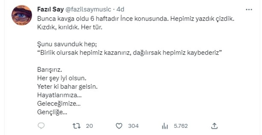 "Bunca kavga oldu 6 haftadır İnce konusunda. Hepimiz yazdık çizdik. Kızdık, kırıldık. Her tür. Şunu savunduk hep; "Birlik olursak hepimiz kazanırız, dağılırsak hepimiz kaybederiz" Barışırız. Her şey iyi olsun. Yeter ki bahar gelsin. Hayatlarımıza... Geleceğimize... Gençliğe..."