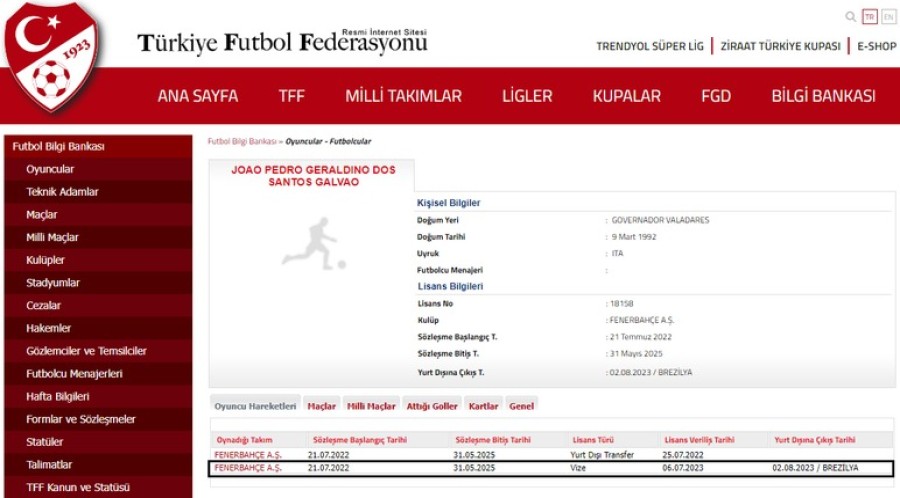 Fenerbahçe'nin, Brezilya ekiplerinden Gremio ile anlaştığı belirtilen Joao Pedro'nun ayrılığını TFF'ye bildirdiği açıklandı.
