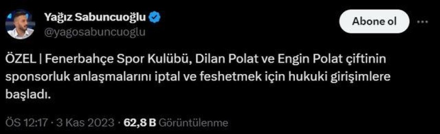 Gazeteci Yağız Sabuncuoğlu'nun aktardığına göre; Fenerbahçe, Dilan Polat ve Engin Polat çiftinin sponsorluk anlaşmalarını iptal ve feshetmek için hukuki girişimlere başladı.