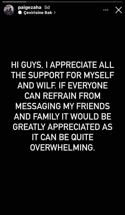 Instagram hesabından bir hikaye paylaşan Wilfried Zaha'nın eşi Paige Zaha, "Aileme ve arkadaşlarıma mesaj atmazsanız çok mutlu olurum" ifadelerine yer verdi.