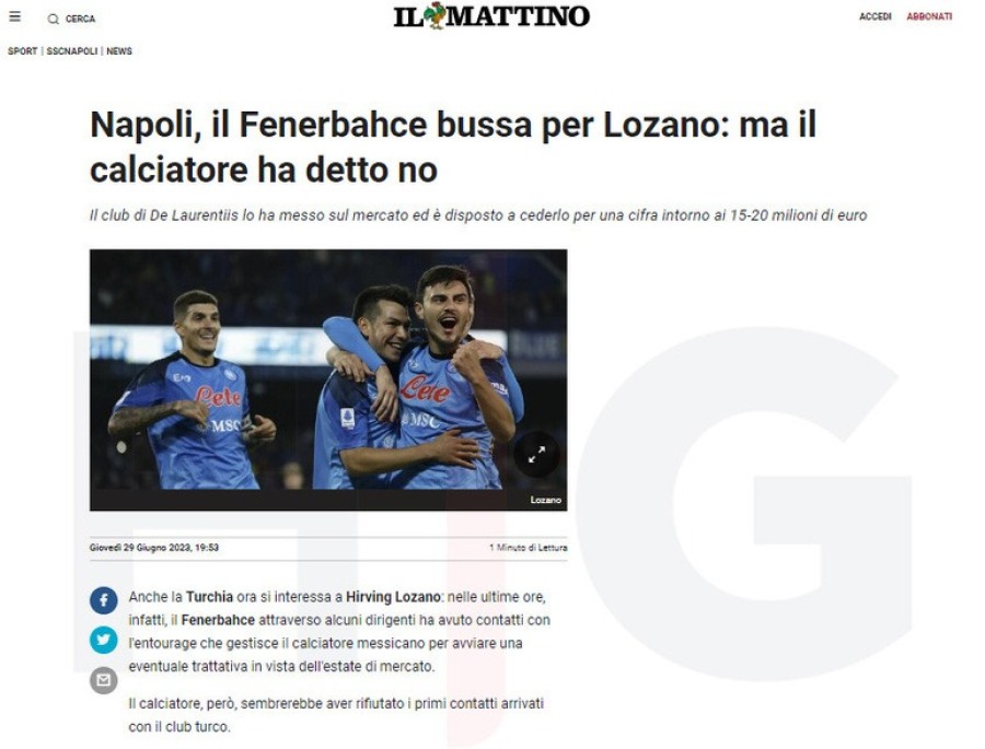 Napoli'de yayın yapan Il Mattino gazetesinin haberine göre; Fenerbahçeli yöneticiler geçtiğimiz saatlerde Hirving Lozano'nun transferi için Meksikalı futbolcunun menajerleriyle iletişime geçti ve oyuncunun şartlarını sordu.