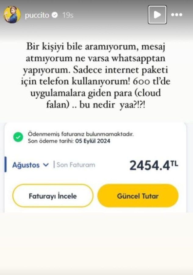 Şimdi ise Selen Işık Pınar, Instagram hesabından bir aylık telefon faturasıyla gündem oldu. "Bir kişiyi bile aramıyorum, mesaj atmıyorum. Ne varsa Whatsapp'tan yapıyorum. Sadece internet paketi için telefon kullanıyorum. 600 TL de uygulamalara giden para. Bu nedir ya?" sözleriyle sitem eden ünlü isim 2454 TL'lik faturaya isyan etti. Birçok kullanıcı Pucca'ya destek verdi ve yüksek gelen faturalarını paylaştı.