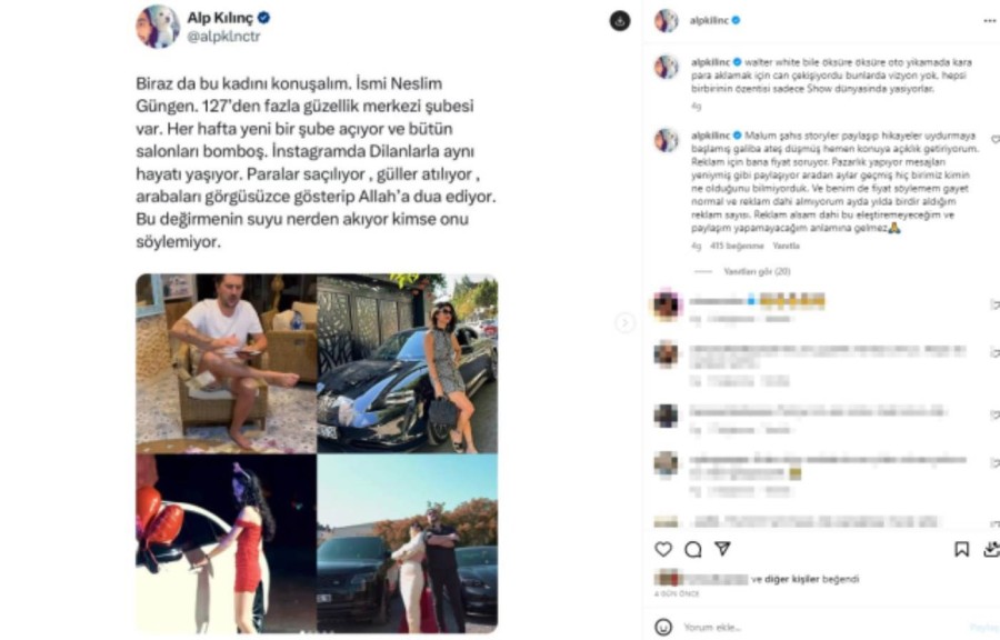Yıllar önce Hande Erçel'e "Bazlama surat" dediği için davalık olan ve para cezasına çarptırılan Alp Kılınç, Polat operasyondan sonra Instagram'da lüks yaşamlarını gözler önüne seren güzellik merkezi sahibi Neslim Güngen için "Instagram'da Dilan'larla aynı hayatı yaşıyor. Paralar saçılıyor, güller atılıyor, arabaları görgüsüzce gösterip Allah'a dua ediyor. Bu değirmenin suyu nereden akıyor kimse onu söylemiyor" demişti.
