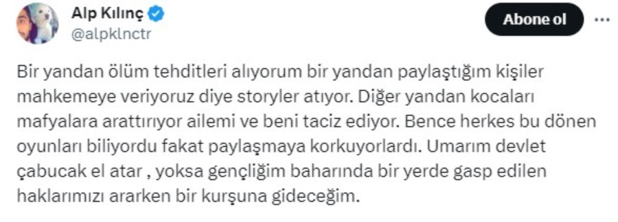 X hesabından yaptığı paylaşımda yaşadıklarından bahseden fenomen, "Bir yandan ölüm tehditleri alıyorum bir yandan paylaştığım kişiler 'mahkemeye veriyoruz' diye stroyler atıyor. Diğer yandan kocaları mafyalara arattırıyor ailemi ve beni taciz ediyor. Bence herkes bu dönen oyunları biliyordu fakat paylaşmaya korkuyorlardı. Umarım devlet çabucak el atar, yoksa gençliği baharında bir yerde gasp edilen haklarımızı ararken bir kurşuna gideceğim" ifadelerini kullandı.