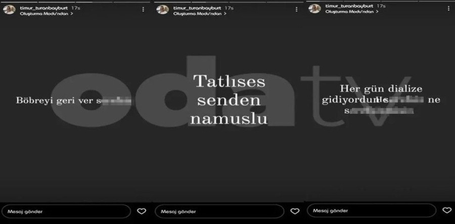 Timur Turanbayburt'un babası hayattayken yaptığı bir sosyal medya paylaşımında kullandığı sert ifadeler de ortaya çıktı. Baba ve oğulun neden tartışma yaşadıkları bilinmezken, Turanbayburt'un "Böbreği geri ver ş... Tatlıses senden namuslu... Her gün diyalize giriyordun ş...." ifadeleri tartışma yarattı.