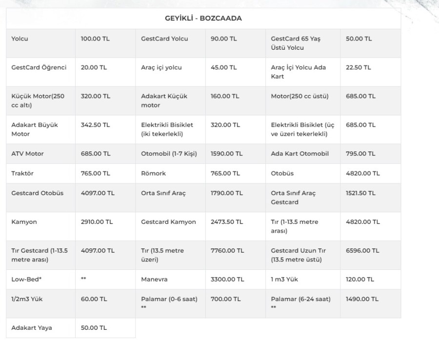 2- Buna göre, Geyikli-Bozcaada hattı otomobil fiyatı 570 TL iken, 24 Ağustos 2024 tarihindeki yeni fiyat tarifesinde 795 TL olarak güncellenmiştir.