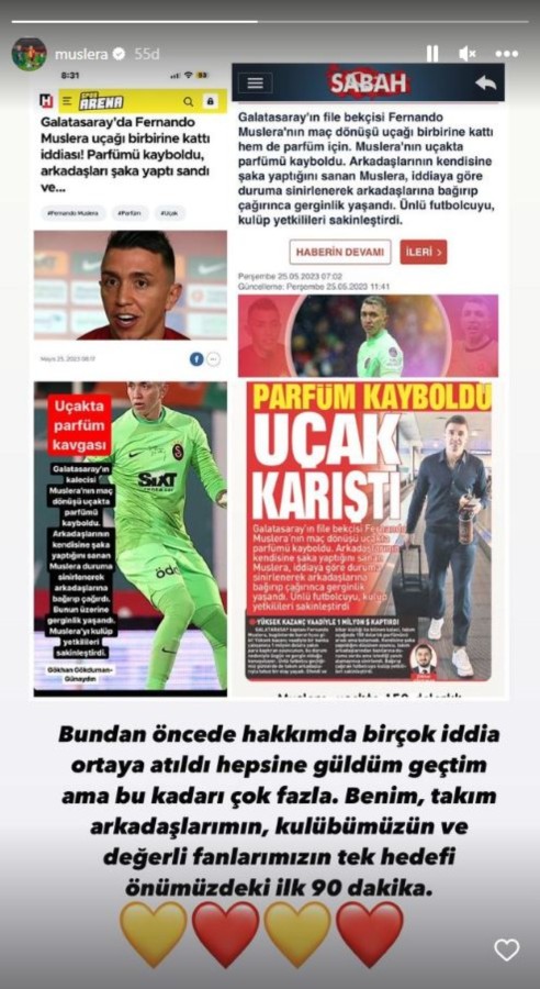 Galatasaray'ın tecrübeli kalecisi Fernando Muslera, "parfüm kavgası" başlığıyla atılan haberlere sert tepki gösterdi. Muslera yaptığı paylaşımda 'Bu kadarı çok fazla' dedi.