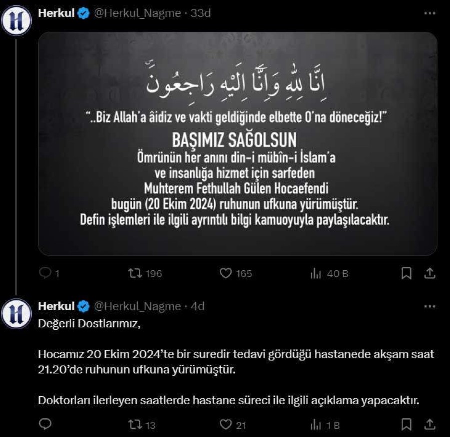 Herkül sitesinin X (Twitter) hesabından yapılan paylaşımda, Gülen'in 20 Ekim'de (dün) öldüğü belirtildi.