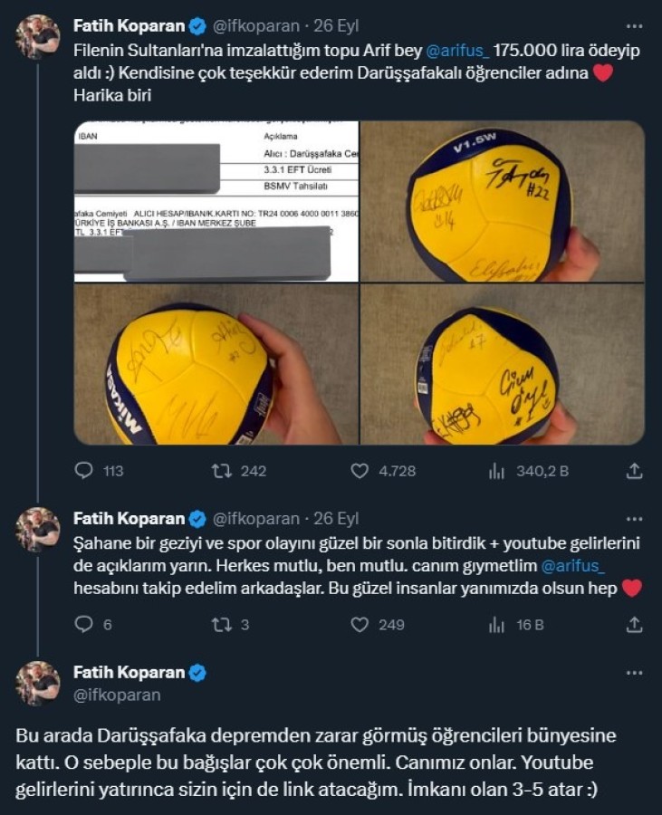 YouTube gelirlerini Darüşşafaka'ya bağışlayacağını açıklayan Koparan, Filenin Sultanlarına imzalattığı topu X (Twitter) hesabından açık artırmayla sattı.