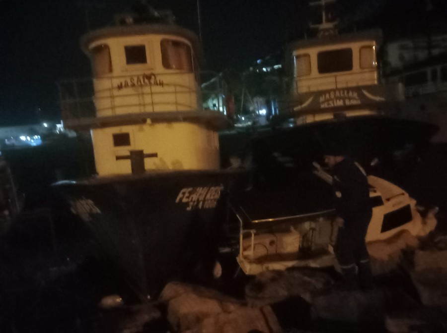 Yaklaşık 5 saat süren çalışmayla bağlanan tekne, vinçle karaya çekildi.