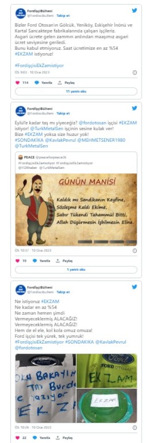 Paylaşımlardan birinde "Bizler Ford Otosan'ın Gölcük, Yeniköy, Eskişehir İnönü ve Kartal Sancaktepe fabrikalarında çalışan işçileriz. Asgari ücrete gelen zammın ardından maaşımız asgari ücret seviyesine geriledi. Bunu kabul etmiyoruz. Saat ücretimize en az %54 #EKZAM istiyoruz!" ifadeleri kullanıldı.