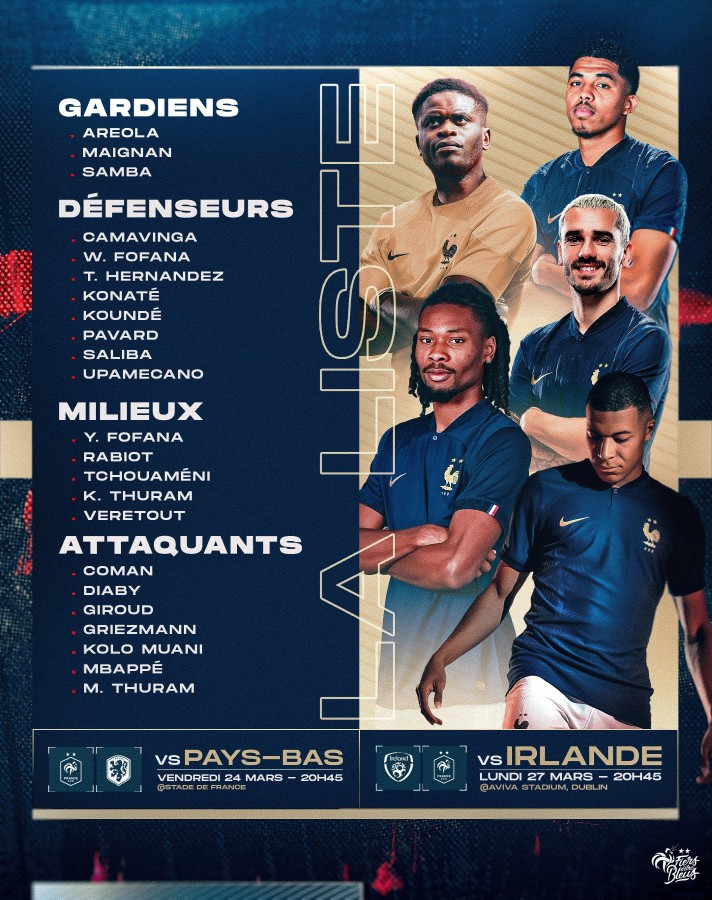Fransa Milli Takımı, EURO 2024 Elemeleri'nde Hollanda ve İrlanda ile oynayacağı maçların kadrosunu duyurdu.