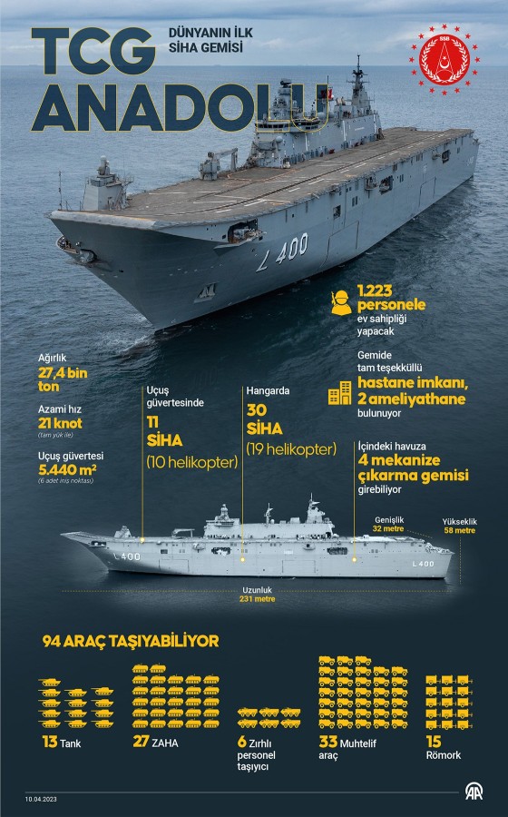 TCG Anadolu'nun 231 metre uzunluk, 32 metre genişliğe sahip olduğu ve Türkiye'nin ilk uçak ve en büyük savaş gemisi olduğuna dikkat çekildi.