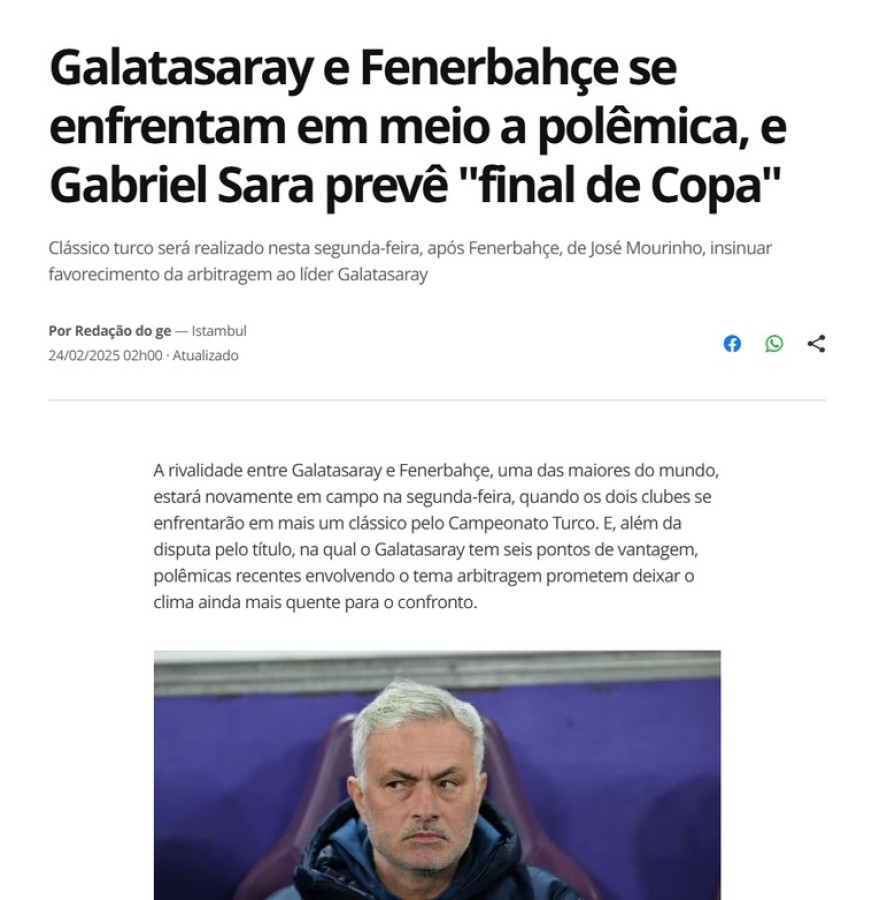 Galatasaray'ın başarılı orta sahası Gabriel Sara, derbi öncesi ülkesi Brezilya basınına konuştu. Sara, Galatasaray-Fenerbahçe derbisi için, "Dünya Kupası finali gibi görülüyor" açıklamasında bulundu.