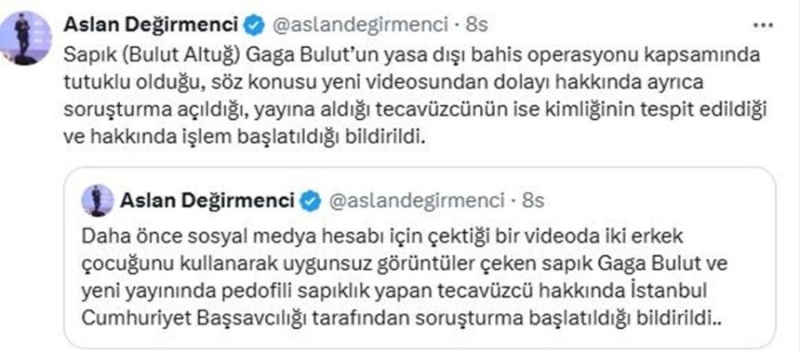 İletişim Başkanlığı Dijital Medya Koordinatörü Aslan Değirmenci konuyla ilgili olarak yaptığı paylaşımda Gaga Bulut ve yayına katılan pedofili sapık ile ilgili soruşturma başlatıldığını açıkladı.