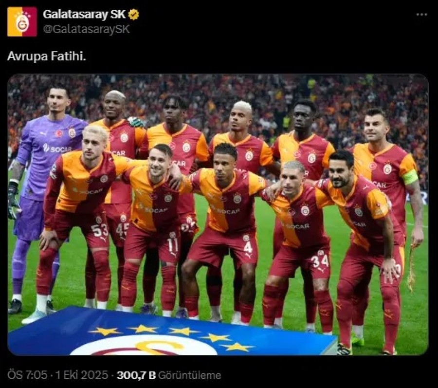Sarı-kırmızılılar sosyal medya hesabından yaptığı paylaşımda Galatasaray kadrosunun fotoğrafını paylaşarak, 'Avrupa Fatihi' notu düştü.