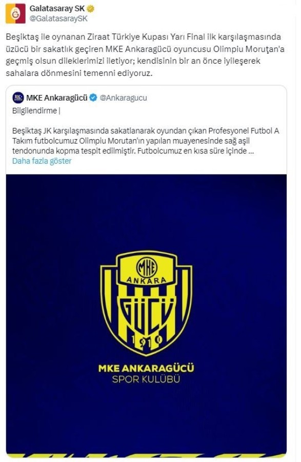 Sarı-kırmızılıların resmi internet sitesinden konuyla ilgili yapılan paylaşımda, "Beşiktaş ile oynanan Ziraat Türkiye Kupası Yarı Final ilk karşılaşmasında üzücü bir sakatlık geçiren MKE Ankaragücü oyuncusu Olimpiu Morutan'a geçmiş olsun dileklerimizi iletiyor; kendisinin bir an önce iyileşerek sahalara dönmesini temenni ediyoruz" denildi.