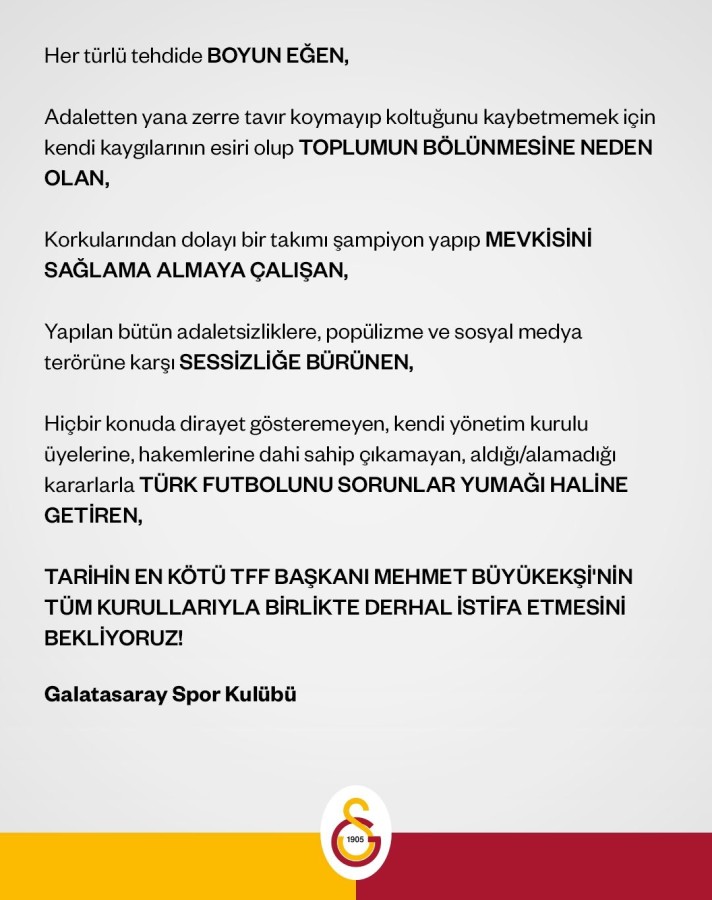"Her türlü tehdide boyun eğen, adaletten yana zerre tavır koymayıp koltuğunu kaybetmemek için kendi kaygılarının esiri olup toplumun bölünmesine neden olan, korkularından dolayı bir takımı şampiyon yapıp mevkisini sağlamaya çalışan, yapılan bütün adaletsizliklere, popülizme ve sosyal medya terörüne karşı sessizliğe bürünen, hiçbir konuda dirayet gösteremeyen, kendi yönetim kurulu üyelerine, hakemlerine dahi sahip çıkamayan, aldığı/alamadığı kararlarla Türk futbolunu sorunlar yumağı haline getiren tarihin en kötü TFF Başkanı Mehmet Büyükekşi'nin tüm kurullarıyla birlikte derhal istifa etmesini bekliyoruz."