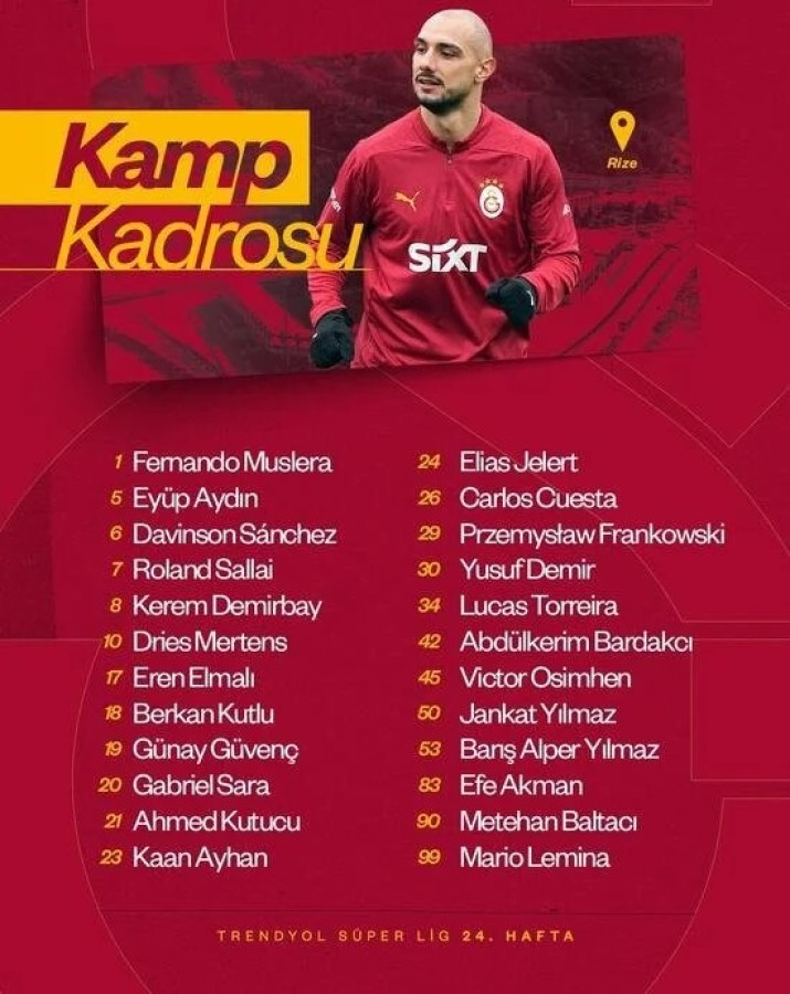 Süper Lig'de Rizespor ile karşılaşacak Galatasaray, bu maçın kamp kadrosunu duyurdu.