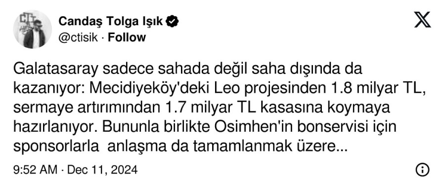 Gazeteci Candaş Tolga Işık, Galatasaray'ın mali tabloda elinin rahatlayacağını, Osimhen'in bonservisi için sponsorlarla görüşmede sona geldiğini duyurdu.