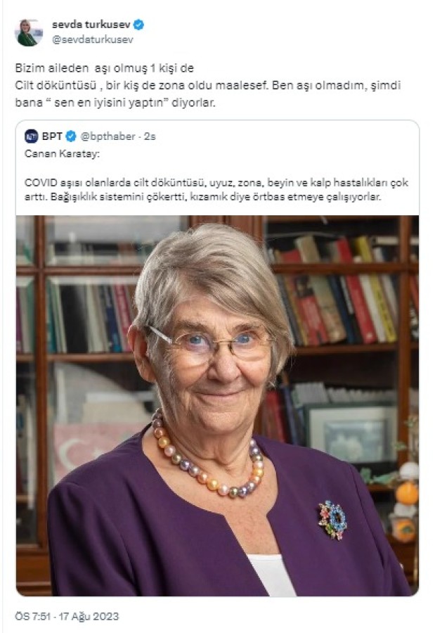Sevda Türküsev, eski adı Twitter olan sosyal medya platformu X'te Canan Karatay'ın Covid 19 aşısı hakkındaki sözlerinin paylaşıldığı tweeti alıntılayarak yanıtladı.