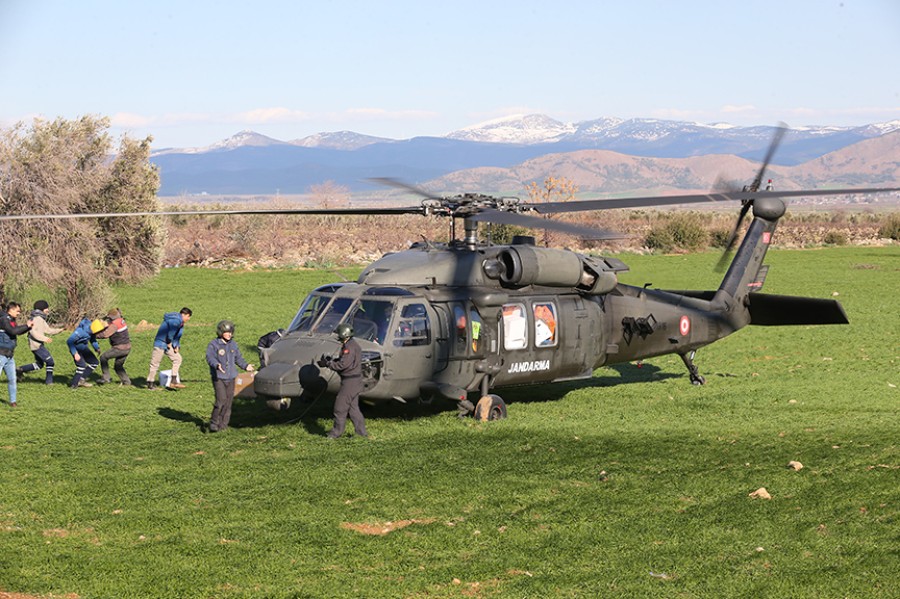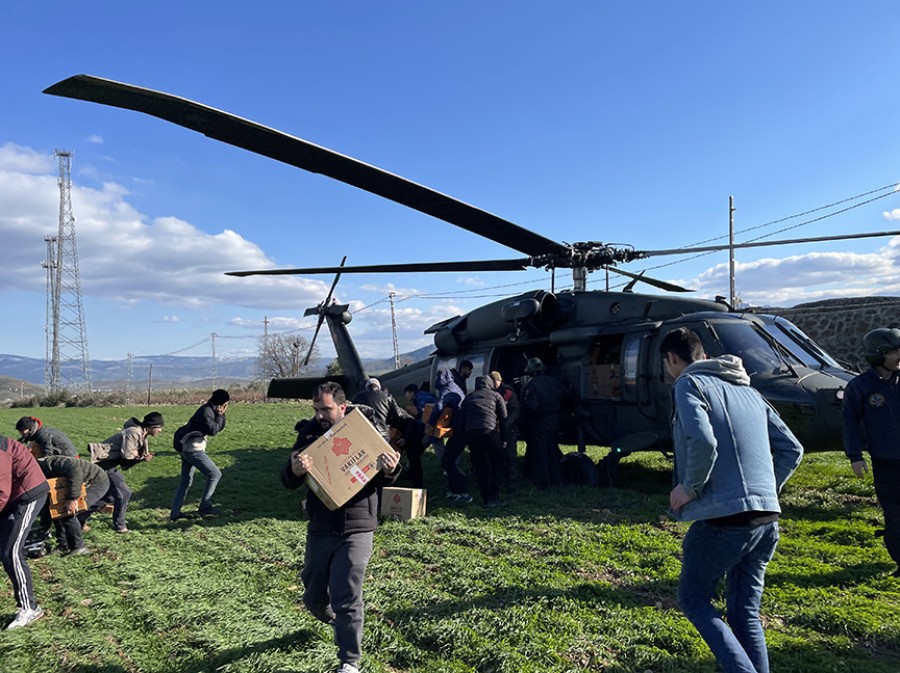 Kahramanmaraş merkezli depremlerden etkilenen Gaziantep'in Nurdağı ve İslahiye ilçelerinin kırsal mahallelerine askeri helikopterlerle yardım malzemeleri taşındı.