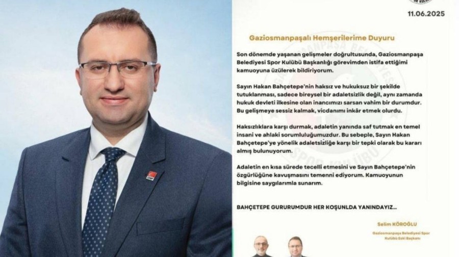 Gaziosmanpaşa Belediyesi Spor Kulübü Başkanı Selim Köroğlu, CHP'li Belediye Başkanı Hakan Bahçetepe'nin tutuklanmasına tepki göstererek görevinden istifa ettiğini duyurdu. Köroğlu, "Bahçetepe'nin haksız ve hukuksuz bir şekilde tutuklanması, sadece bireysel bir adaletsizlik değil, aynı zamanda hukuk devleti ilkesine olan inancımızı sarsan vahim bir durumdur" dedi.