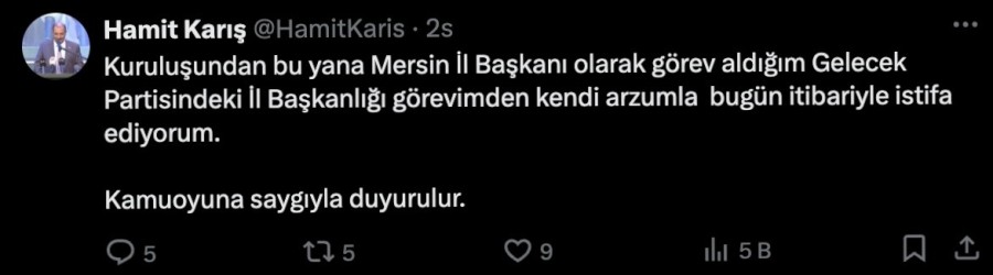 "Kuruluşundan bu yana Mersin İl Başkanı olarak görev aldığım Gelecek Partisindeki İl Başkanlığı görevimden kendi arzumla bugün itibariyle istifa ediyorum. Kamuoyuna saygıyla duyurulur."